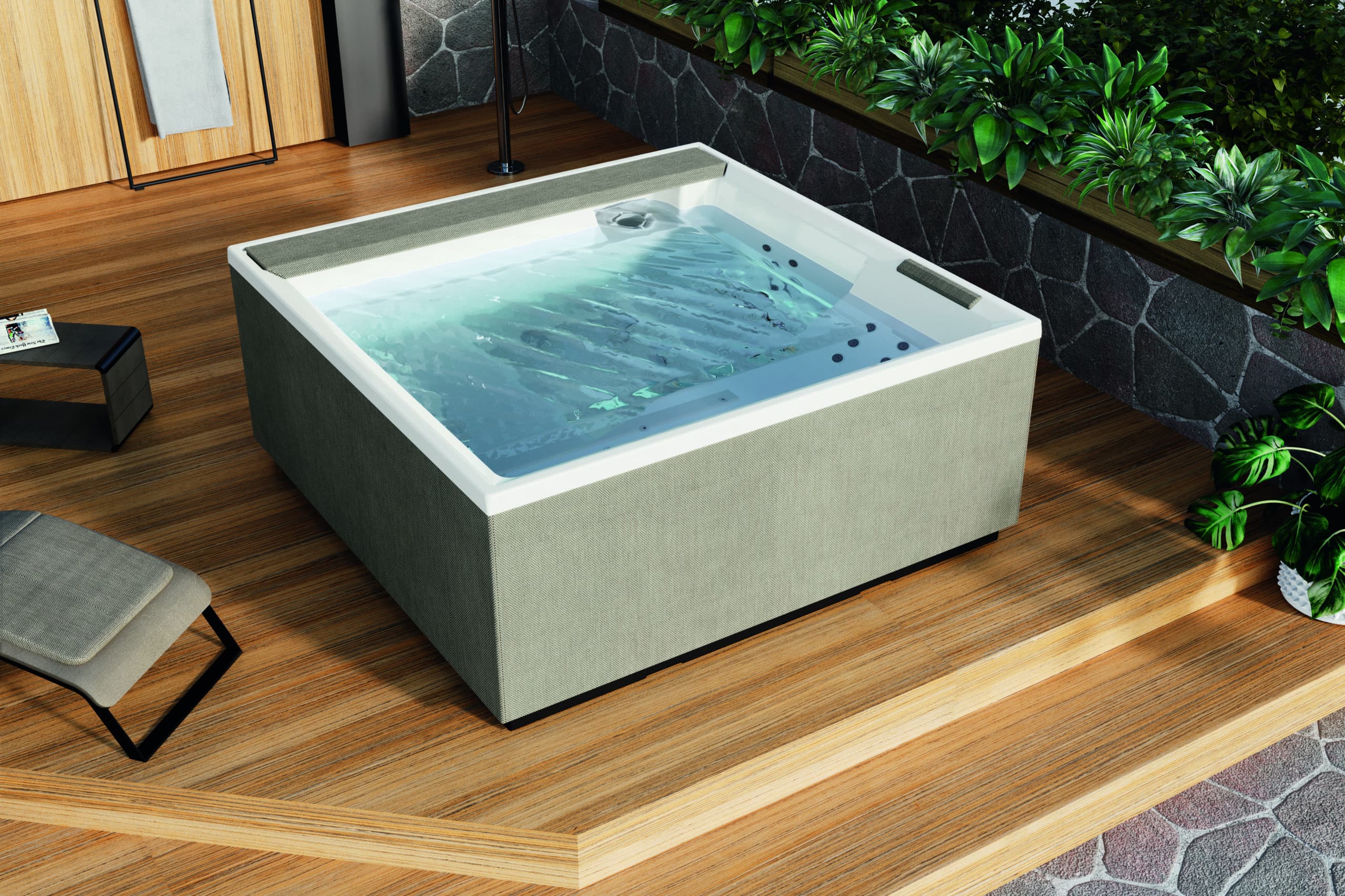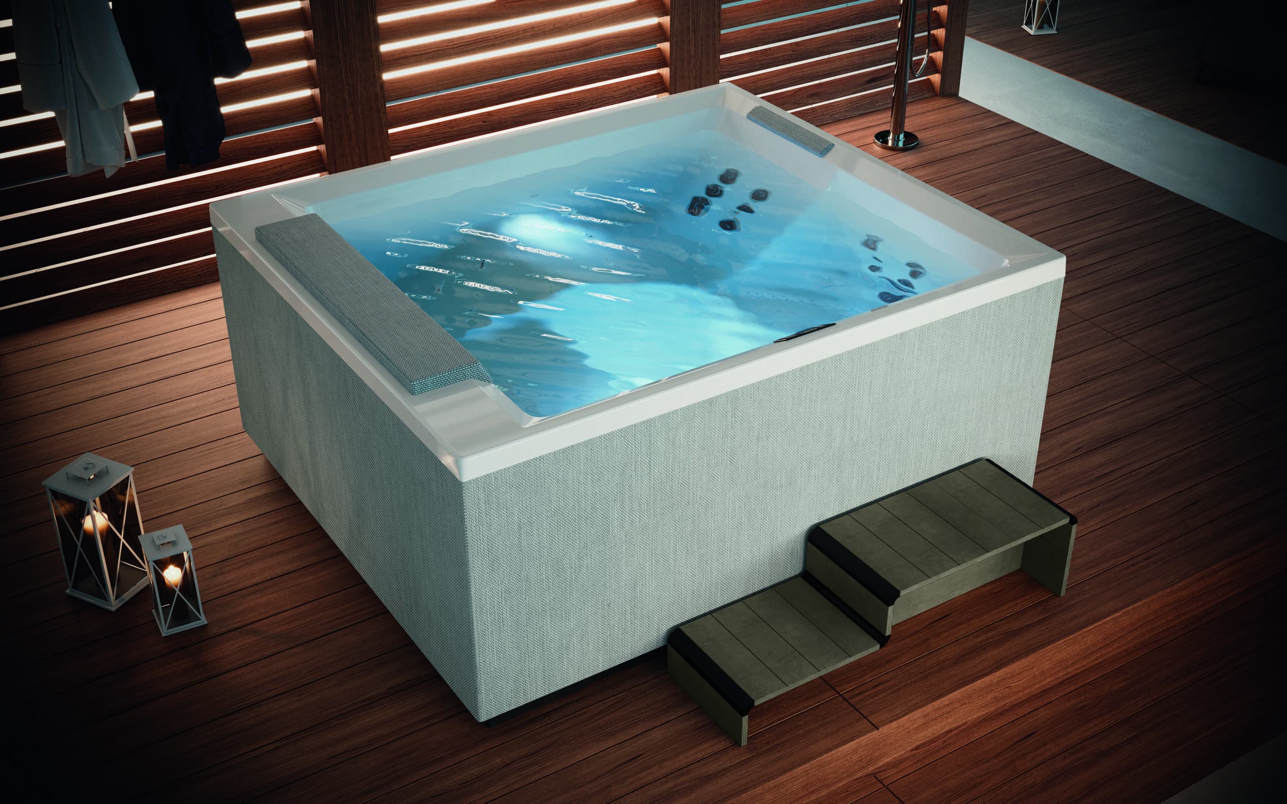 Perfecte SPA voor in huis of in de tuin, met voldoende plaats voor 3 personen. Bad met twee interne diepteniveaus, met één chaise longue en 2 tegenliggende comfortabele zitplaatsen. De verschillende hydromassagevoorzieningen van de verschillende zitplaatsen zorgen voor een compromisloos welzijn. Een moment van totale Relax, aangevuld door het Cromolight-systeem en het Bluetooth-audiosysteem met verborgen speakers aan zowel de binnen- als buitenkant.